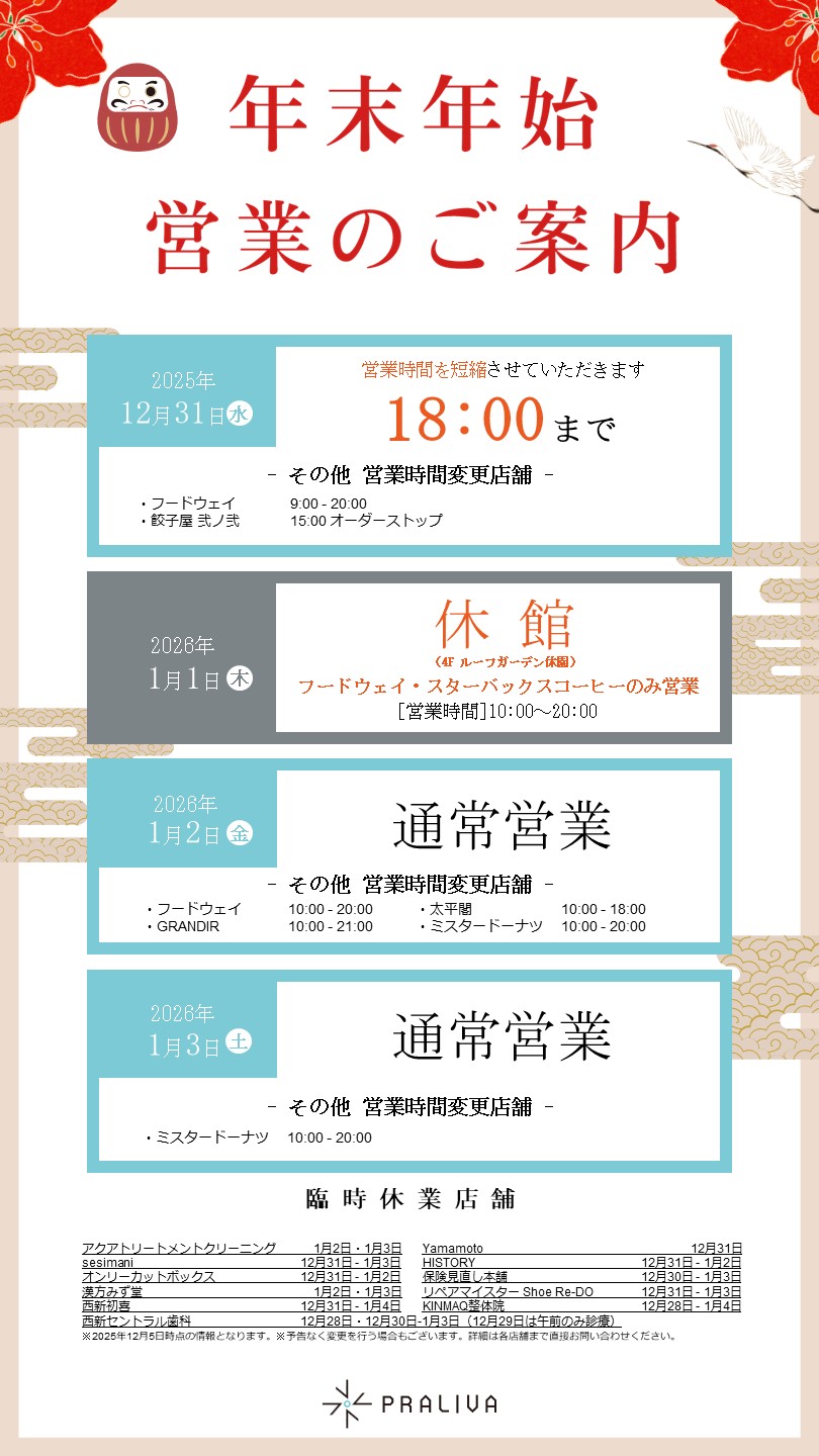 年末年始の営業時間についてPRALIVA全館は以下の通り変更させていただきます。