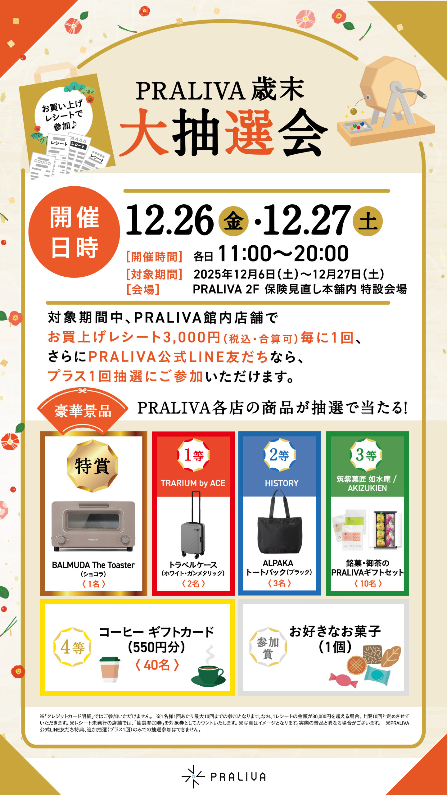 [参加方法] 対象期間中、PRALIVA館内店舗でお買い上げレシート3,000円(税込・合算可)毎に1回ご参加いただけます。