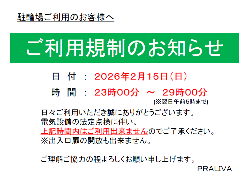 [2月15日(日)] 設備点検に伴う、駐輪場一時利用制限のお知らせ