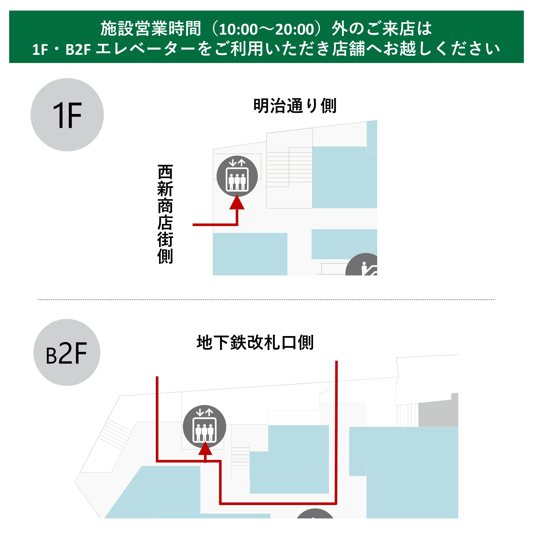 施設営業時間以外での当店へご来店の際は、B2F・1Fのエレベーターをご利用いただき、ご来店ください。