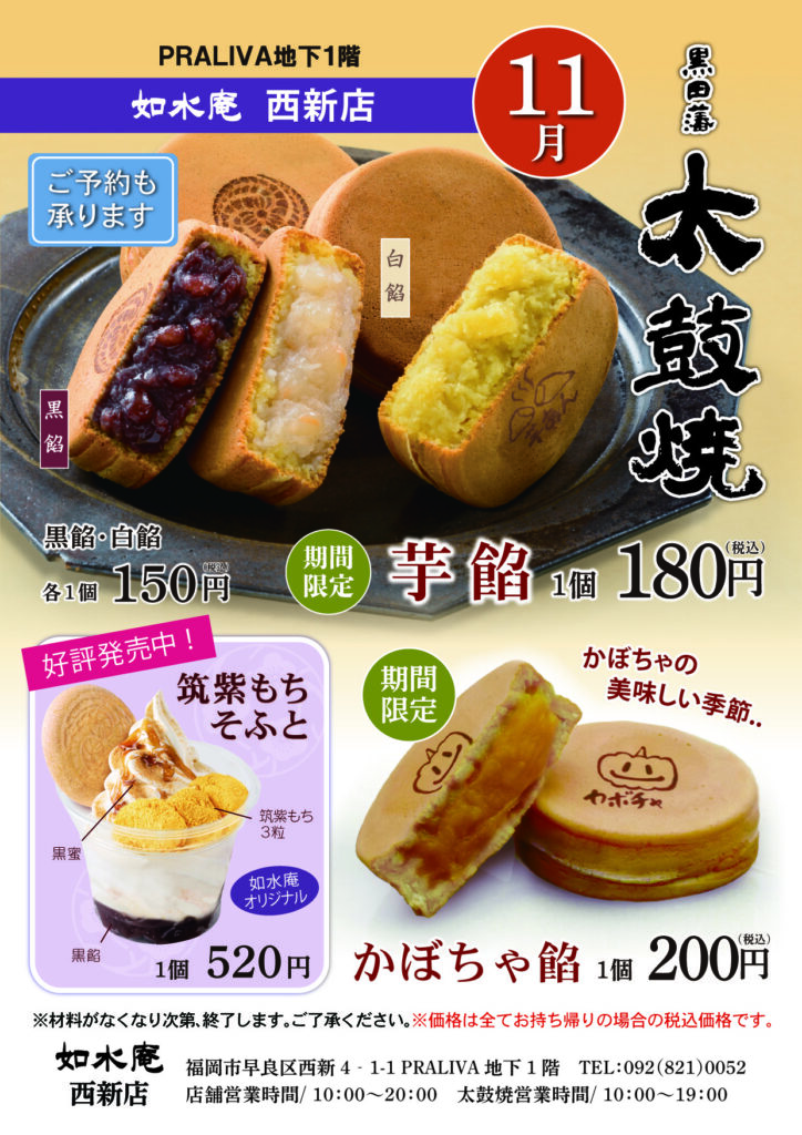 11月の太鼓焼では、黒餡・白餡に加え、期間限定のお味として「芋餡」と「かぼちゃ餡」をご用意いたしております。