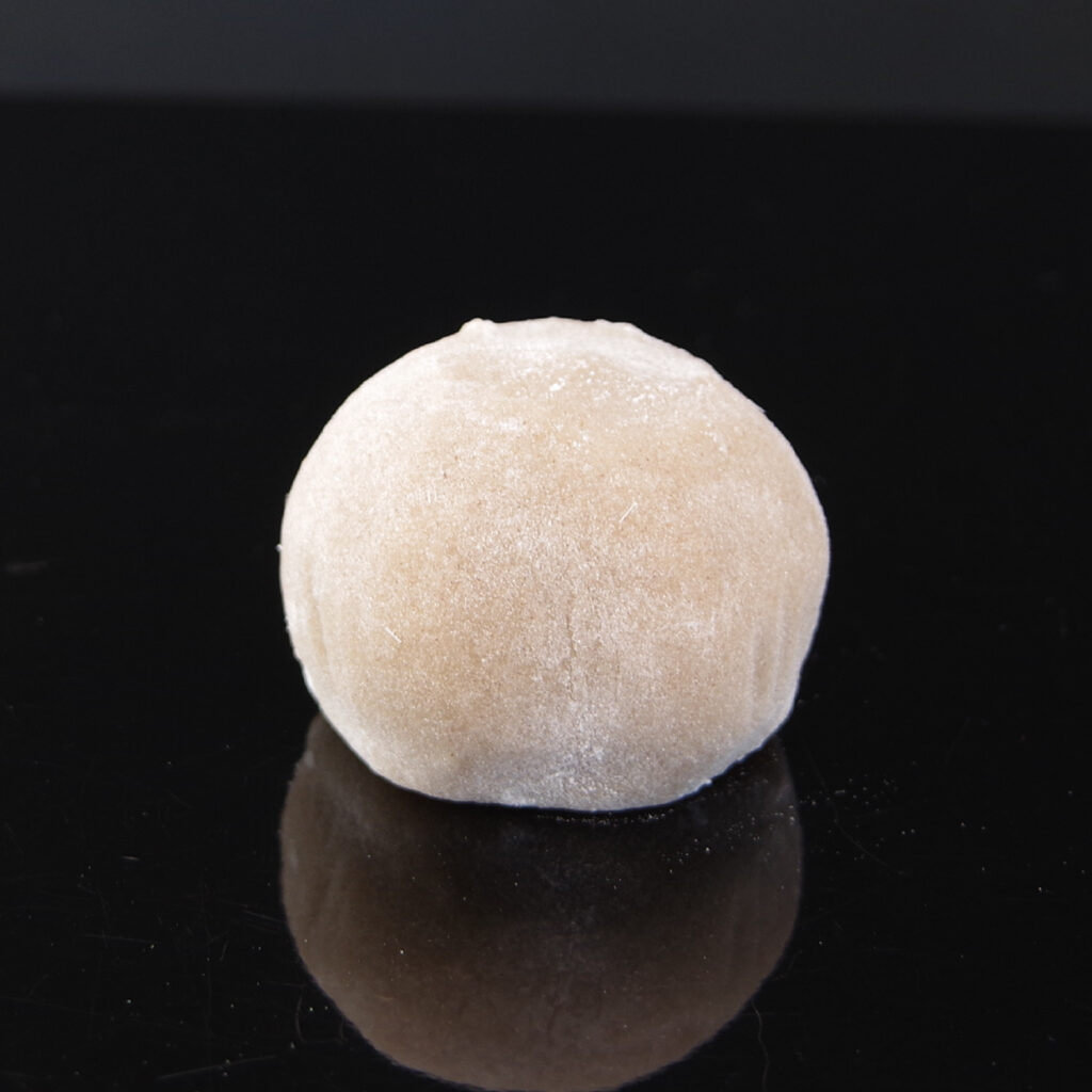 12月の八日餅は「そば餅」でございます。小豆こし餡をそば粉入りの求肥で包みました。