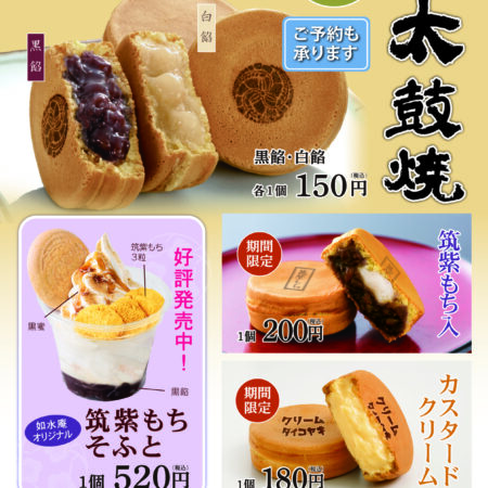 おいしさひとすじ、健康に良いお菓子をお客様に。素材にこだわり、季節を大切にした和菓子を用意しております。また、自家製餡たっぷりの太鼓焼は店内で毎日美味しく焼き上げております。